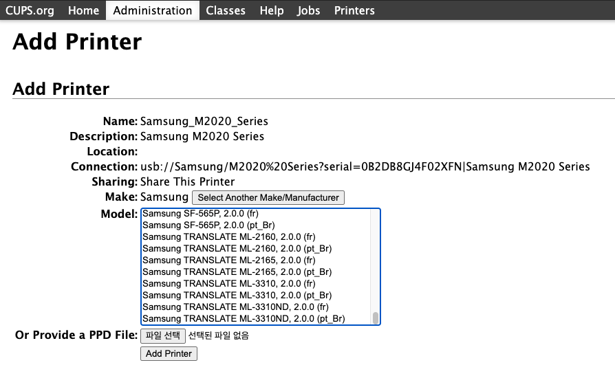 제가 생각한 제일 이상적인 방법이 있으나 최종적으로 실패하였습니다. (이미 NAS는 사용중이고 연결만 하면 되는데...) 시놀로지 운영체제 DSM은 리눅스 기반이고 USB로 연결하면 인식은 됩니다. CUPS가 설치된 것을 보고 드라이버만 설치되면 가능할 거라고 판단했는데, 적합한 드라이버를 찾을 수가 없었습니다. 또 CUPS 관리자 화면을 설정에서 활성화 하더라도 소스파일은 포함시켜두지 않았더군요.