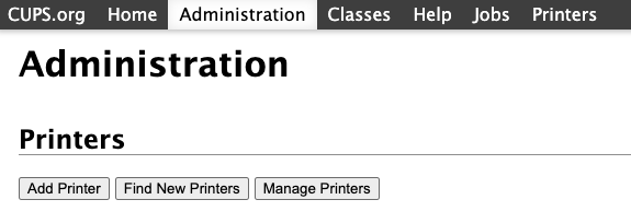 상단 메뉴 중 Administration을 들어가면 프린터를 관리할 수 있습니다. Add Printer를 눌러 추가해줍니다.