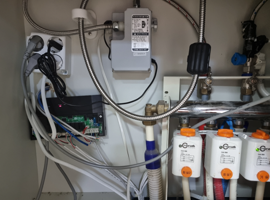 저는 싱크대 아래 밸브 제어기에 랜선을 3미터 정도로 잘라서 라인을 추가해줬습니다. 그리고 선을 빼서 싱크대 위로 올렸습니다. 식기세척기 때문에 싱크대 구멍을 내놓은 게 있어서 나중에 유지보수를 위해 케이블을 밖으로 빼놨습니다.