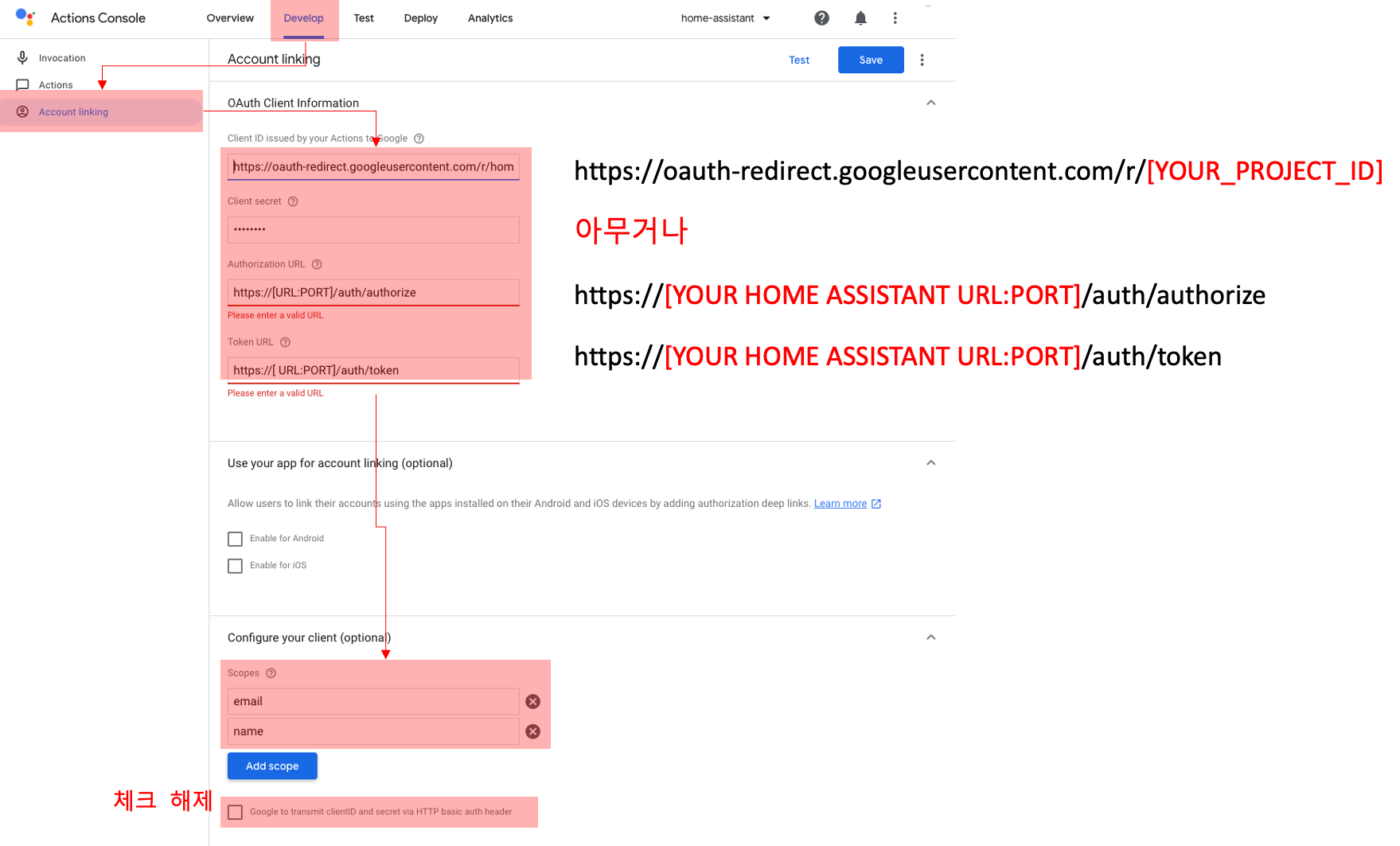 Google Assistant 정보와 구성요소 (스위치, 전등 등)를 입력할 겁니다.