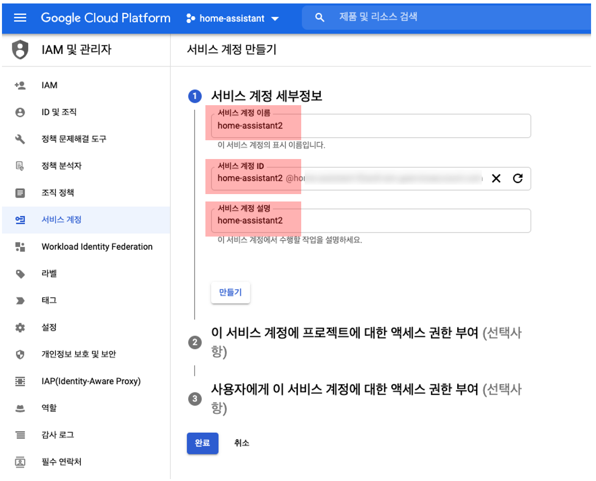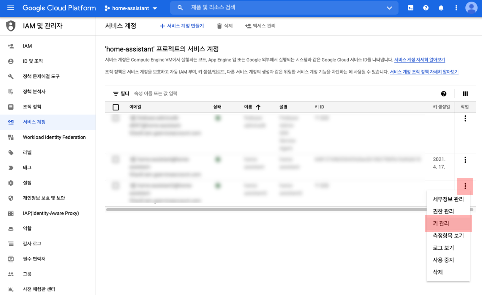 생성된 json 파일이 다운로드됩니다. 이 파일 이름을 service_account.json으로 변경합니다. 나중에 Home Assistant에서 사용됩니다.