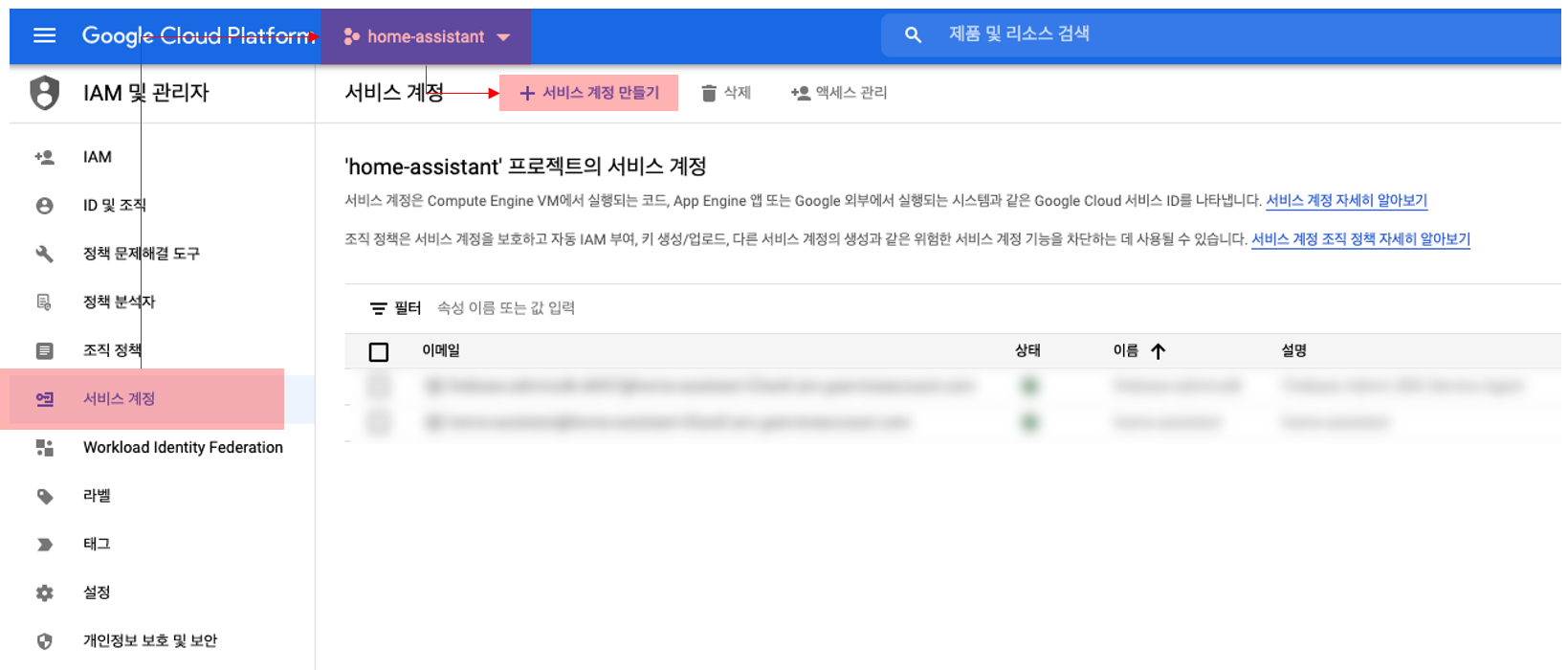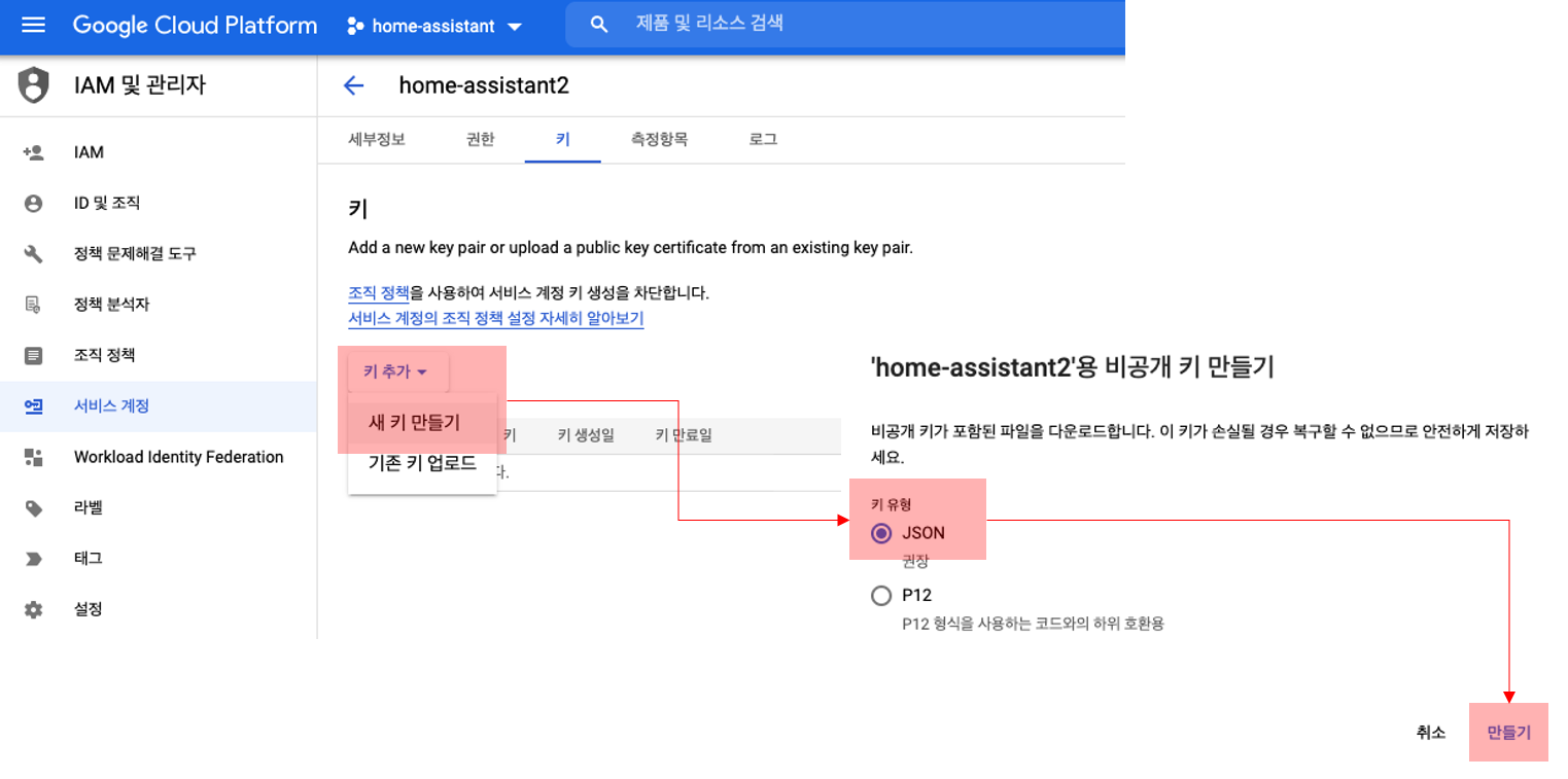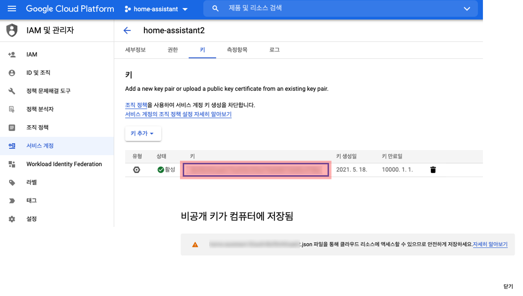 생성된 json 파일이 다운로드됩니다. 이 파일 이름을 service_account.json으로 변경합니다. 나중에 Home Assistant에서 사용됩니다.