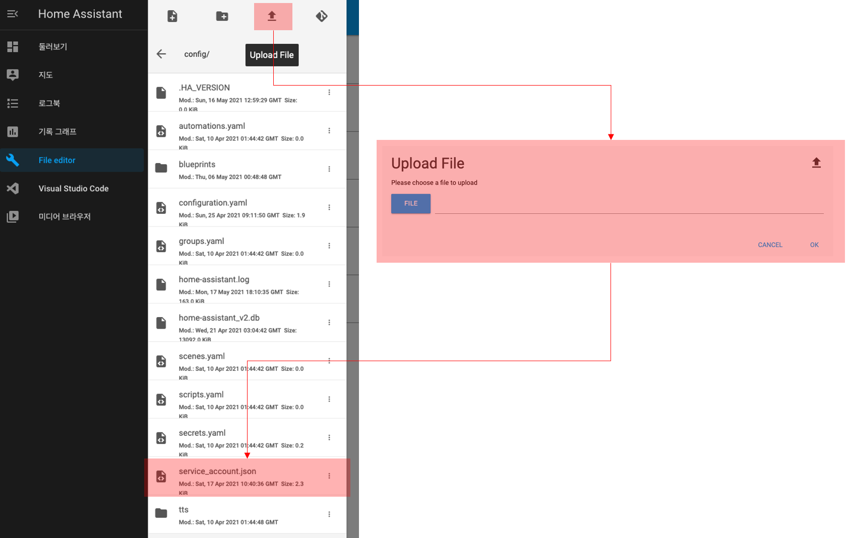 받아놨던 service_account.json 파일을 config 경로에 업로드해줍니다.