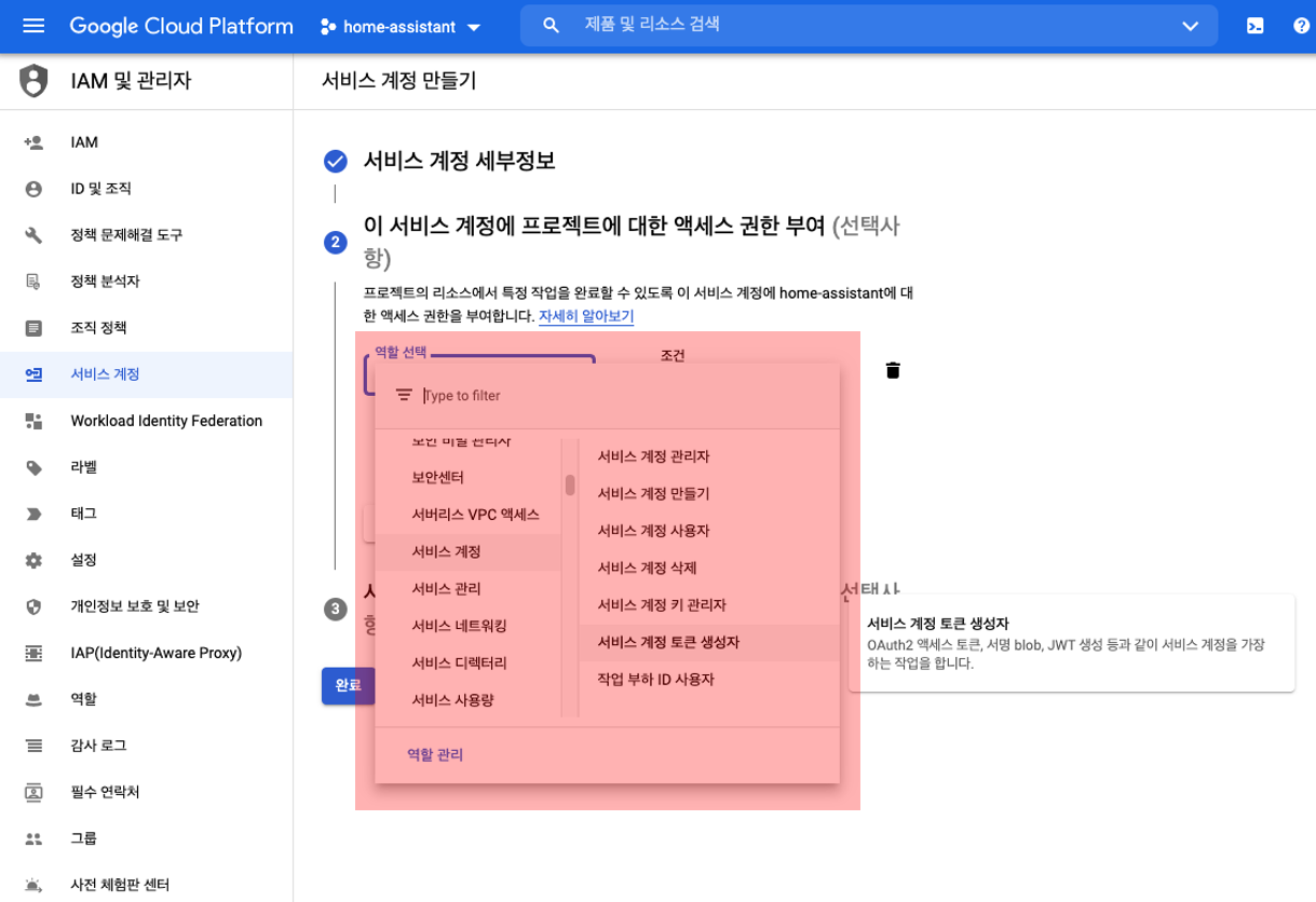 서비스 계정 > 서비스 계정 토큰 생성자 권한 추가