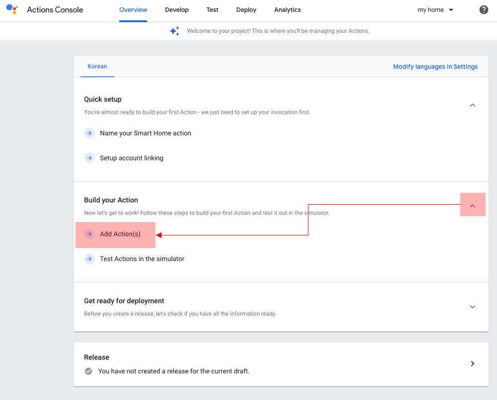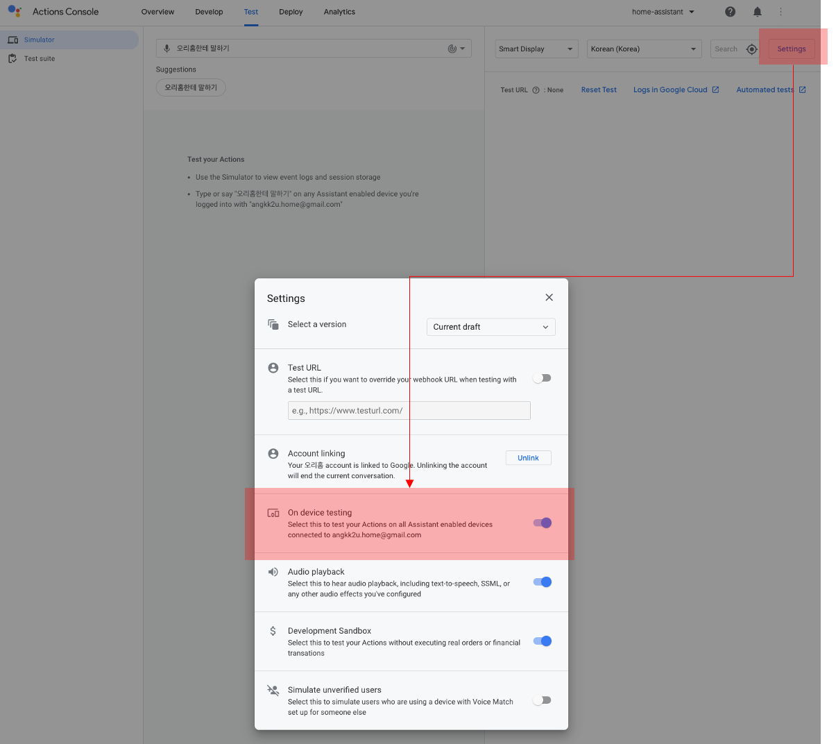 혹시 구글 계정을 여러 개 사용하신다면 Actions on Google에 사용한 계정으로 로그인해줍니다.