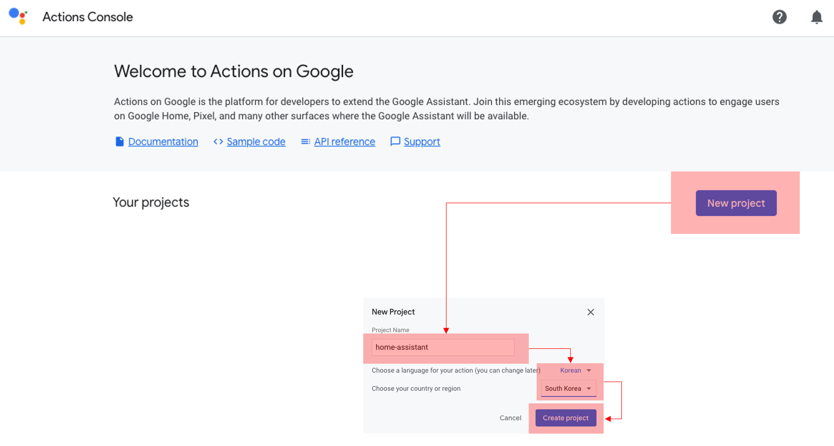 https://console.actions.google.com/ 접속하여 로그인 후 New project를 누릅니다.