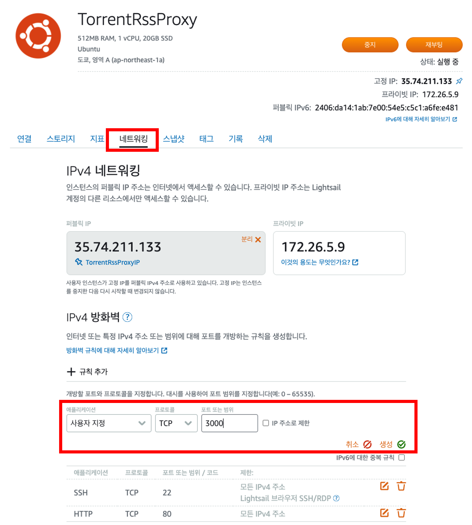 네트워킹 탭에서 방화벽의 3000 포트를 추가합니다.