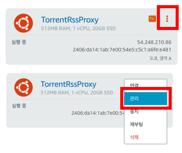 방화벽에 3000포트로 접속할 수 있도록 추가해줍니다. 브라우저로 돌아가서 AWS Lightsail 사이트에서 관리로 들어갑니다.