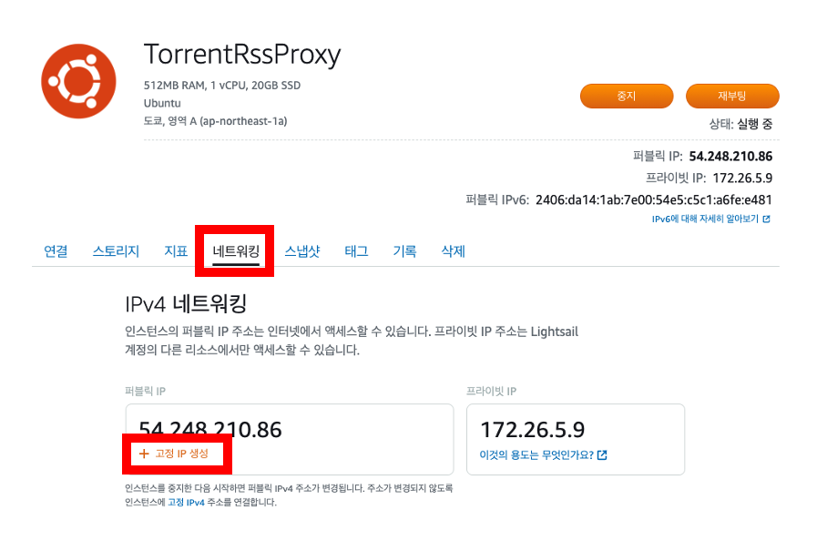 아직은 고정 IP가 없기 때문에 할당해줍니다. 관리 메뉴로 들어가서 네트워킹 탭으로 갑니다.