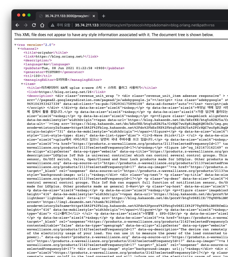 http://[ip주소로변경]:3000/proxy/xml?protocol=https&domain=blog.oriang.net&path=rss