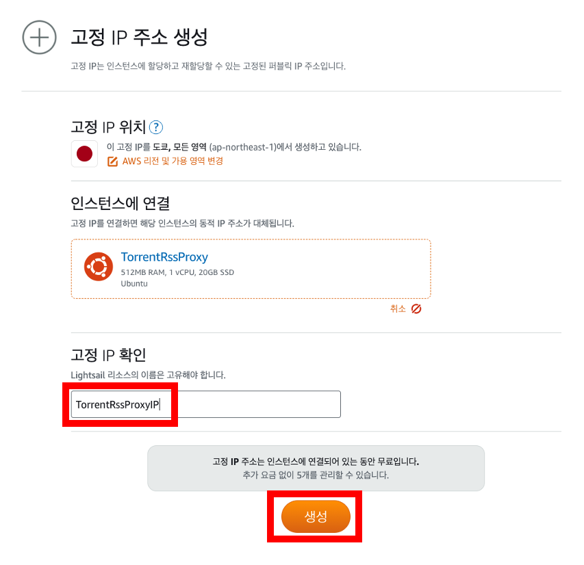 추후 인스턴스를 삭제할 때 고정 IP도 반드시 삭제해야 합니다. 할당되지 않은 고정 IP는 과금됩니다.
