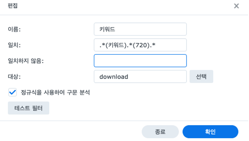 다운로드 필터 탭으로 이동한 뒤 추가 버튼을 누르면 자동으로 다운로드 할 조건을 입력할 수 있습니다.