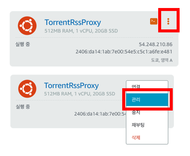 방화벽에 3000포트로 접속할 수 있도록 추가해줍니다. 브라우저로 돌아가서 AWS Lightsail 사이트에서 관리로 들어갑니다.