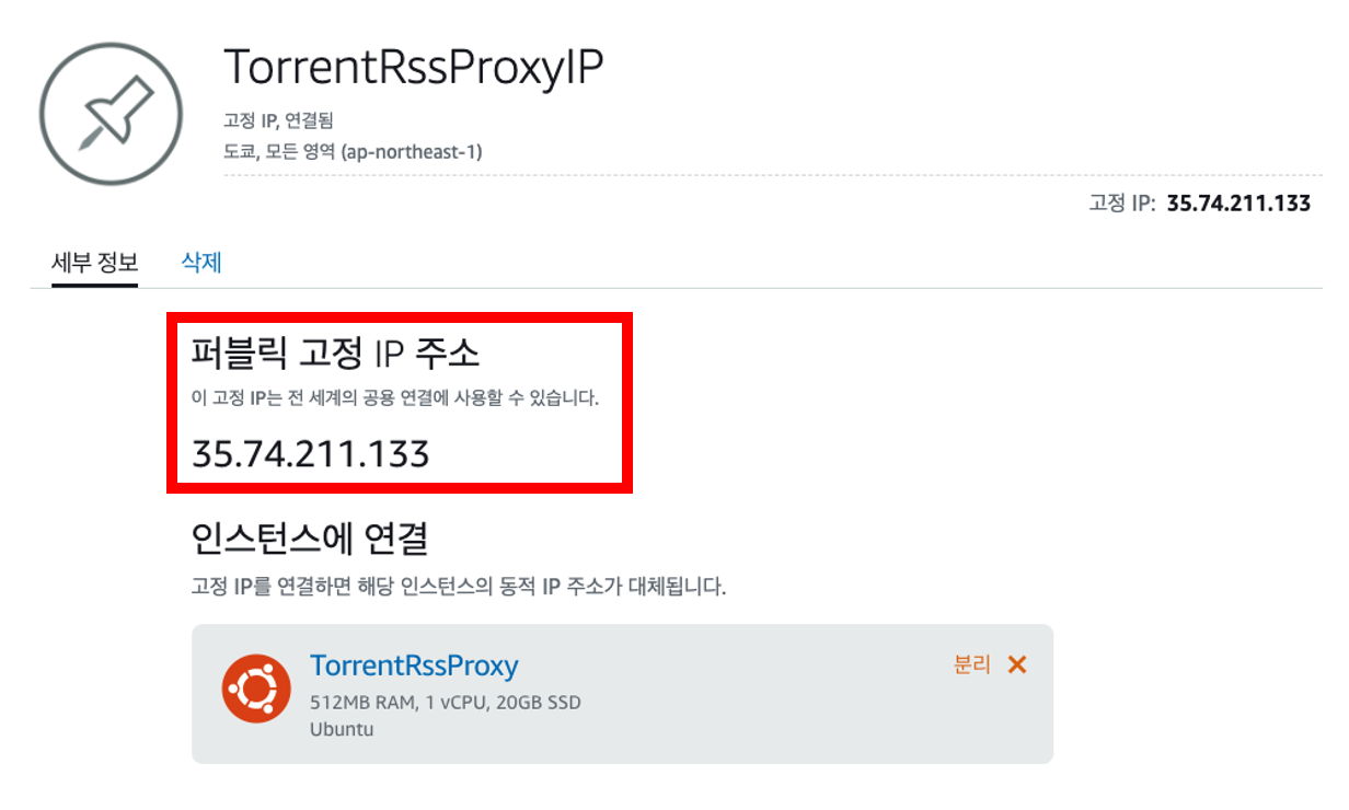 추후 인스턴스를 삭제할 때 고정 IP도 반드시 삭제해야 합니다. 할당되지 않은 고정 IP는 과금됩니다.
