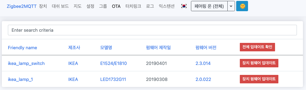 UI에서도 체크할 수 있습니다. (맨 아래쪽 IKEA TRADFRI OTA use test url )