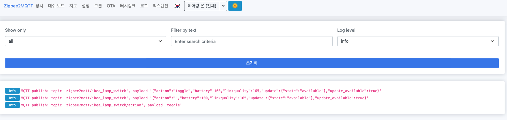 Z2M에 로그를 보면서 진행하시면 좀 더 편하게 확인할 수 있습니다. 이런식으로 로그가 info 레벨로 뜹니다.