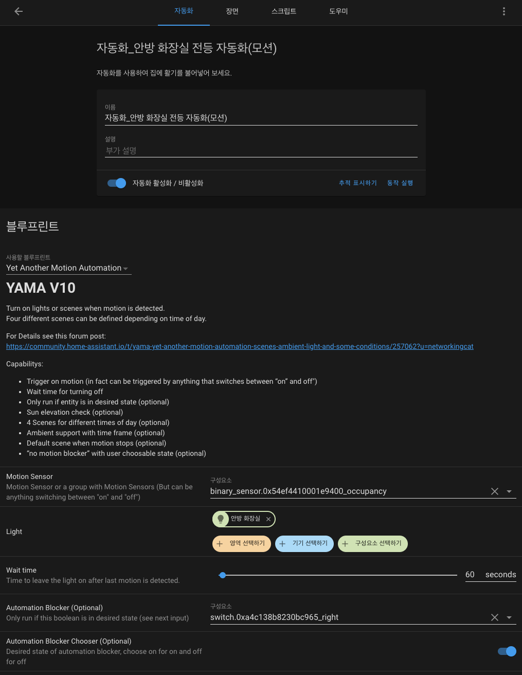 카운터 센서가 출시되면 카운터 센서 + 모션으로 재실 유무를 판단해서 자동화를 다시 구성해볼 생각입니다.