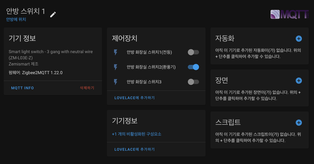 아무 연결 없는 3번 째 스위치는 아래 전등 자동화 부분에서 자동화 여부를 버튼으로 제어 하도록 활용하였습니다.