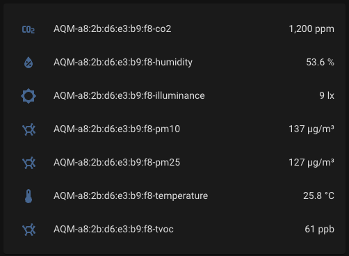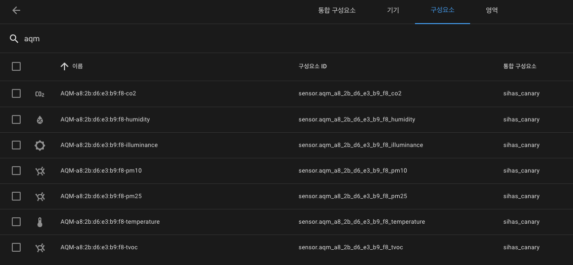 이산화탄소 수치, 습도, 조도, 미세먼제(pm10), 초미세먼지(pm25), 온도, 휘발성유기화합물(tvoc) 수치가 HA에 등록되었고 한 일주일정도 데이터를 좀 더 수집해서 살펴보려고 합니다.