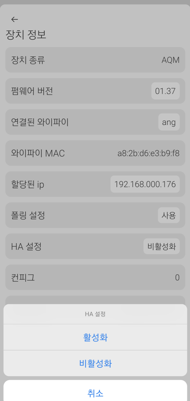 앱을 통해 펌웨어 버전 업데이트를 수행하고 HA 설정 활성화를 해줍니다.