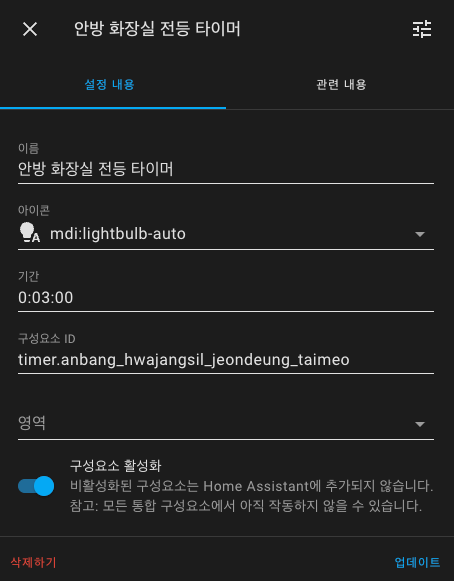 entity_id: timer.anbang_hwajangsil_jeondeung_taimeo