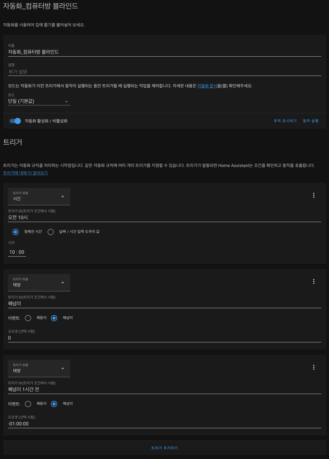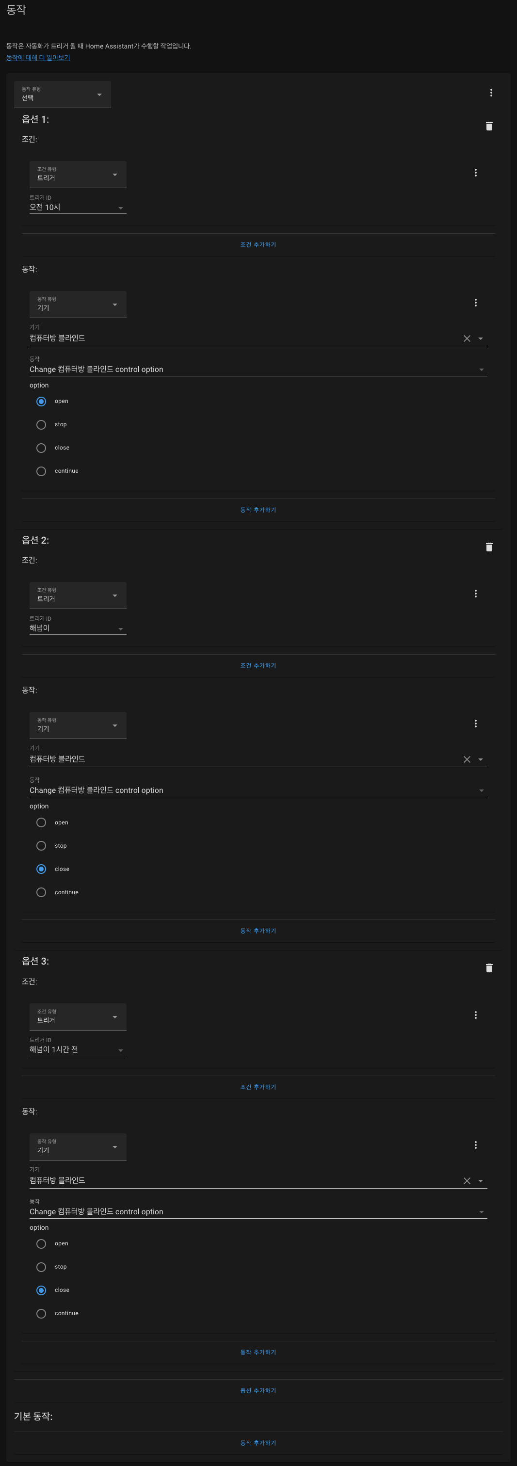오전 10시에 블라인드 올리고 해지기 1시간 전에 내리기 자동화