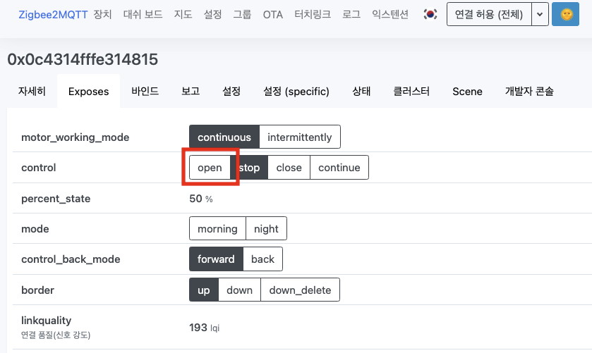z2m exposes 탭에서 open 버튼을 눌러줍니다.