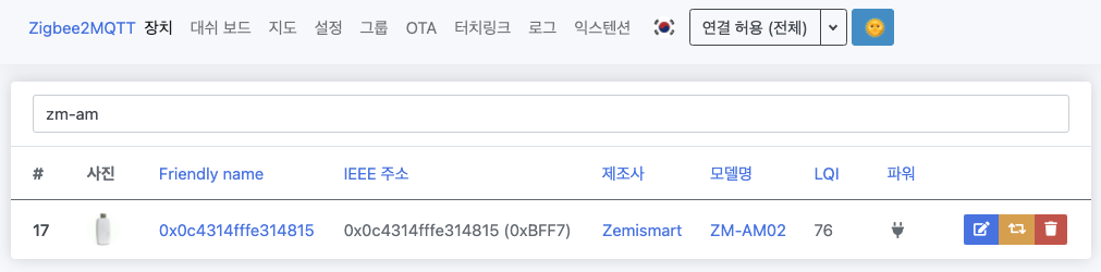 z2m 페이지 상단에 연결 허용을 눌러 페어링 해줍니다.