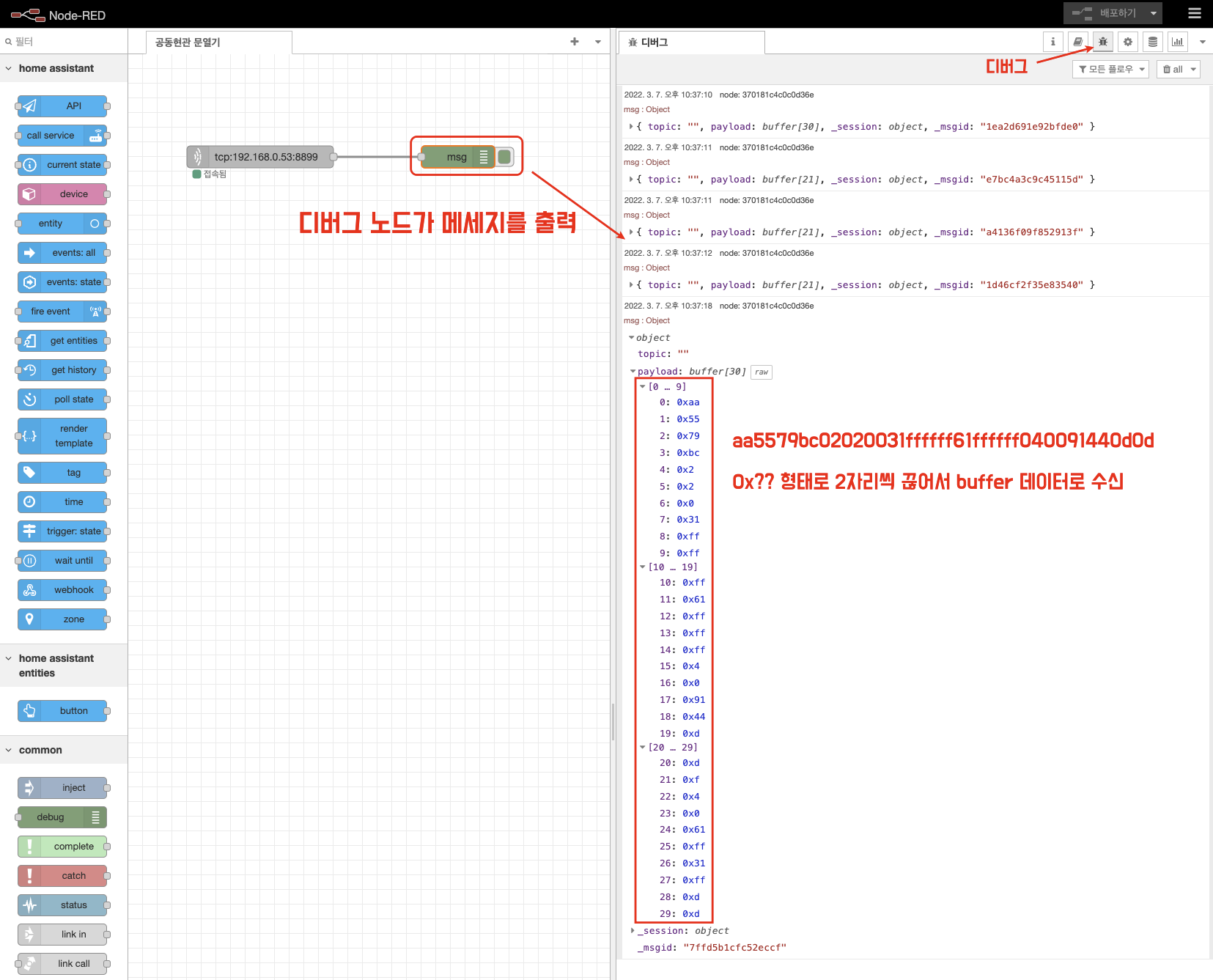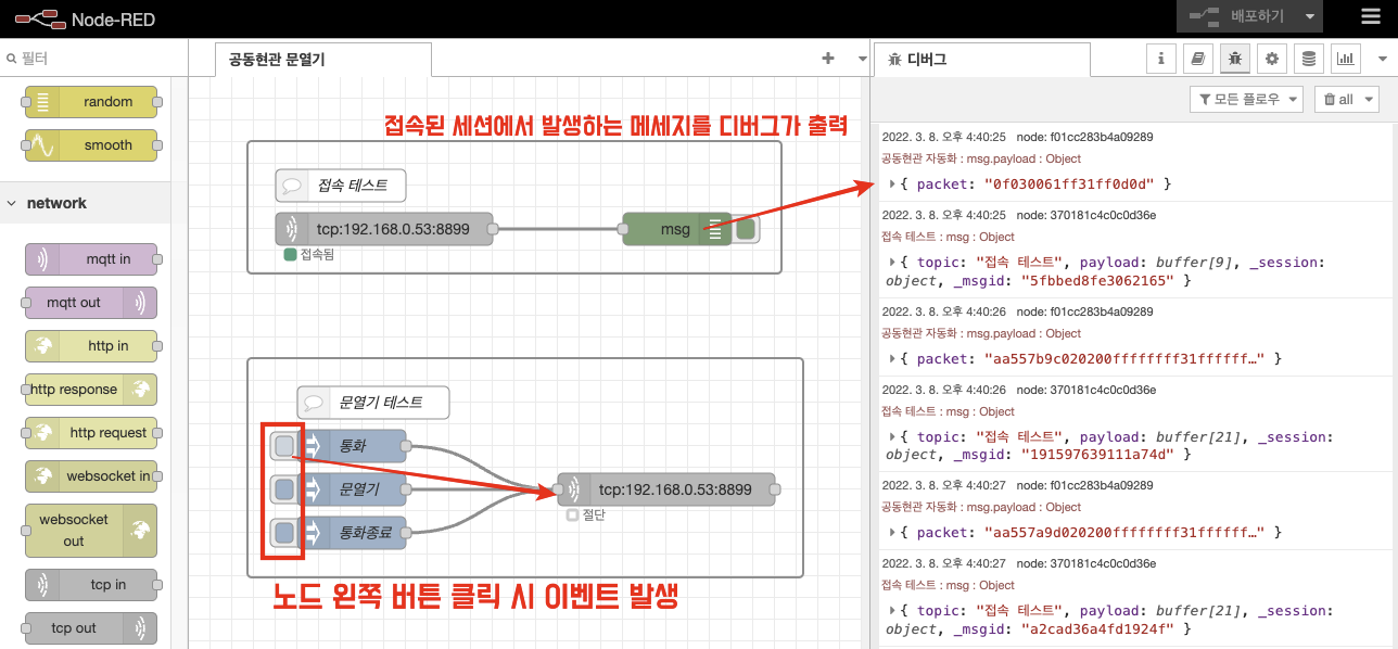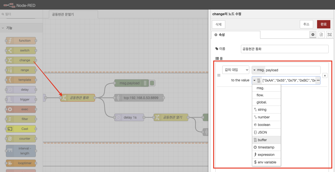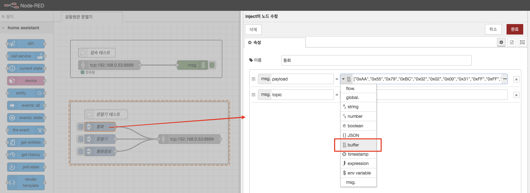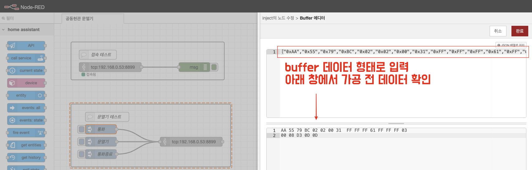 통화, 문열기, 통화종료 패킷은 이전에 분석해둔 것이 있으니 이것을 Node-RED에서 buffer 배열형태로 변환해줍니다.