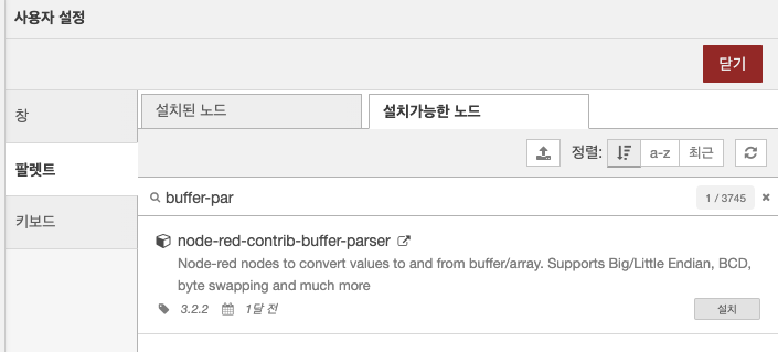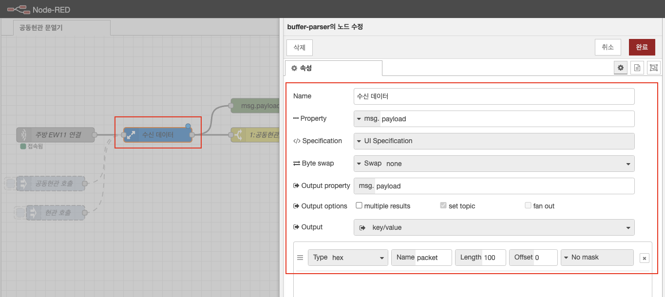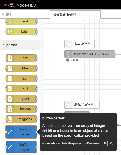 위에서 추가한 node-red-contrib-buffer-parser 라이브러리의 buffer-parser 노드 입니다.