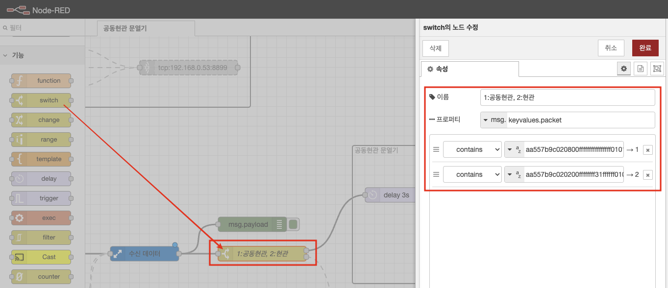 공동현관 패킷이 올라오면 문열기를 하기 위해 switch 노드를 추가 해주립니다.