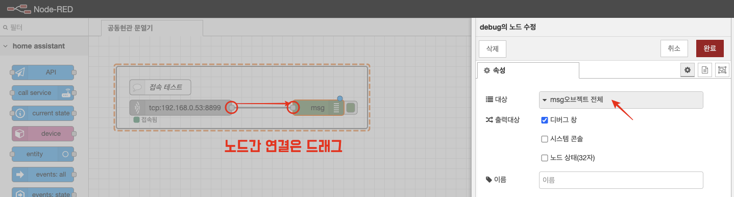 debug 노드에 msg 오브젝트 전체를 선택하고 노드간 데이터가 흘러갈 수 있도록 연결해줍니다.