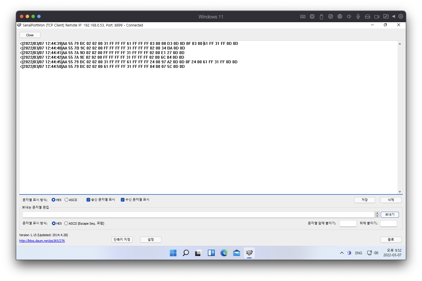 SerialPortMon으로도 동시에 연결해서 확인하면 더욱 좋습니다.