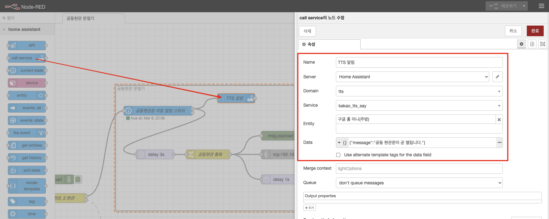 구글 홈 미니로 TTS를 위해 서비스 호출 노드를 추가하였습니다.