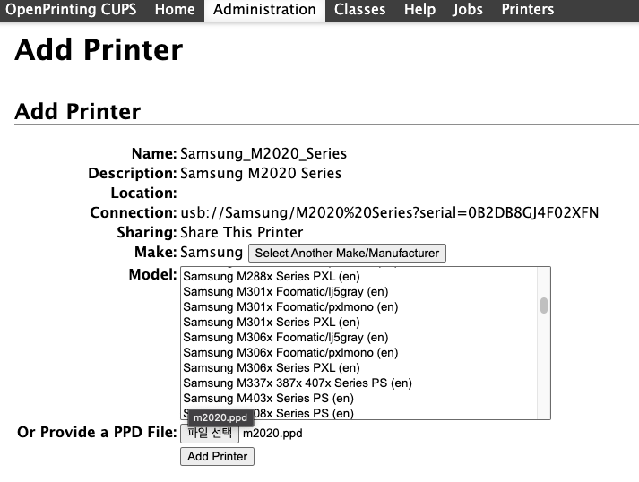 윈도우에서는 프린터 추가 → 이름으로 공유 프린터 선택 → http://192.168.0.21:631/printers/Samsung_M2020_Series