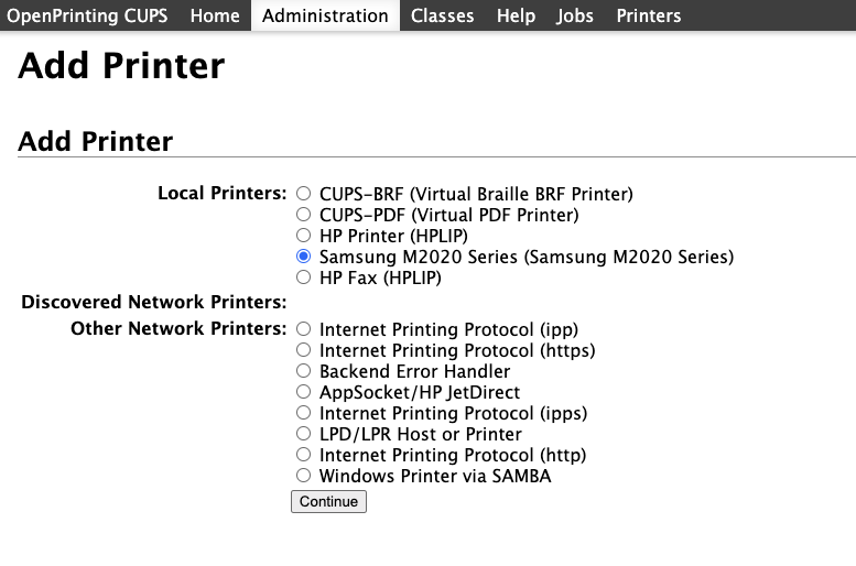 윈도우에서는 프린터 추가 → 이름으로 공유 프린터 선택 → http://192.168.0.21:631/printers/Samsung_M2020_Series