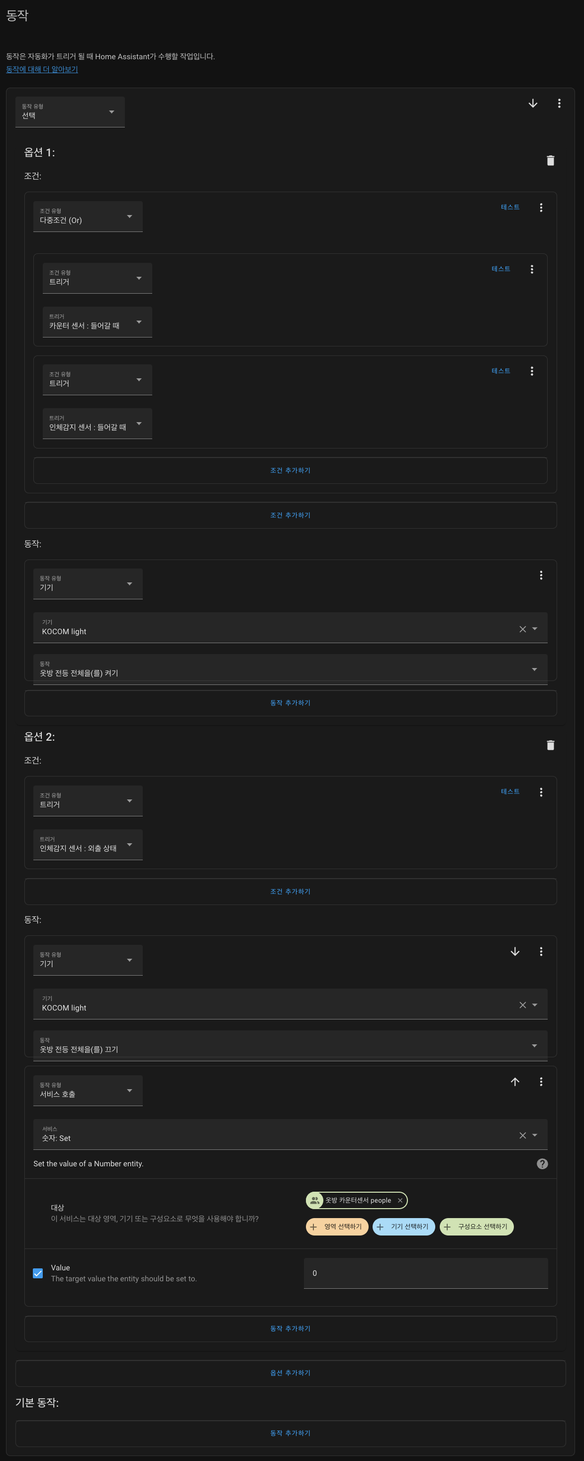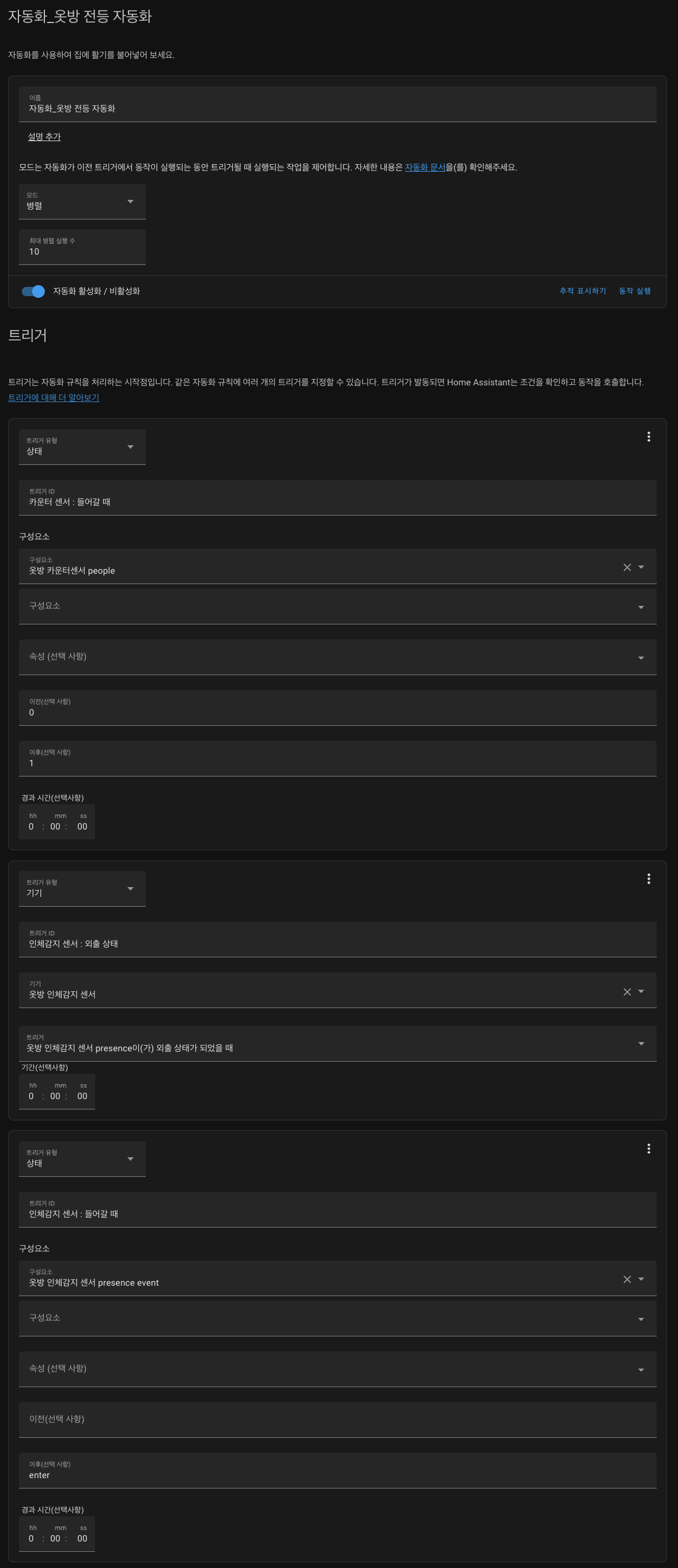 - 들어갈 때 불 켜기 : 카운터 센서가 0→1 또는 인체감지 센서 이벤트 enter 발생 시