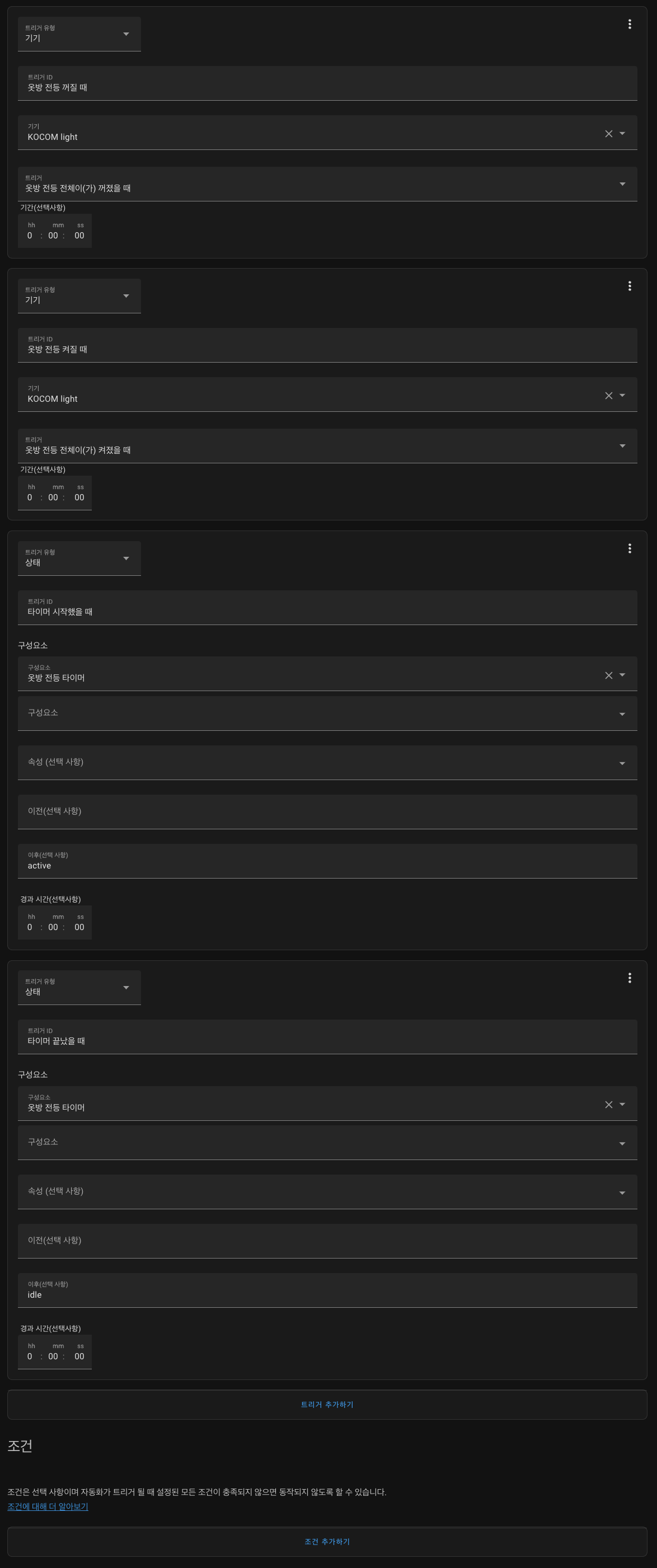 반면 전등을 끌 땐 “나가고 있다"를 사용하지 않고 “나갔다" 이벤트를 사용하기 때문에 10초 이상 있다가 전등이 꺼지게 됩니다.