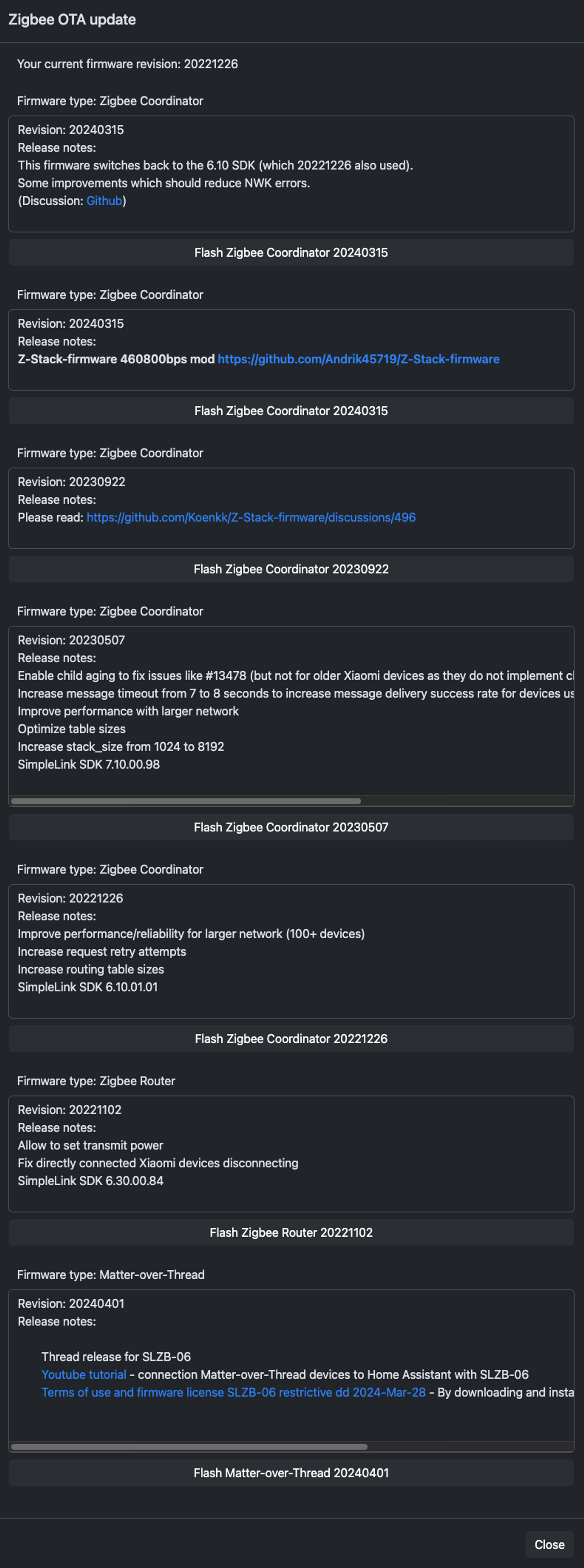 저는 코디네이터로 사용할 것이기 때문에 최신버전인 20240315 버전으로 업데이트를 해줬습니다. 기존 USB 코디네이터 업데이트 하려면 PC에 연결 후 진행해줬어야 했습니다.