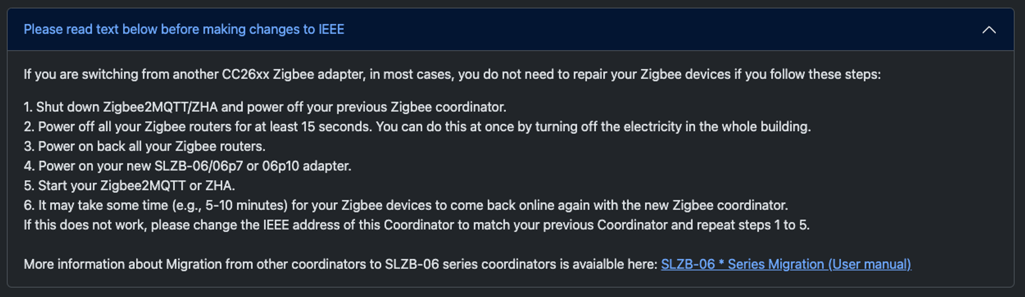 SLZB-06 장치의 컨트롤 패널에서 왼쪽 Z2M and ZHA 메뉴로 들어가면 아래쪽에 ADVANCED: Adapter IEEE address change 란에서 IEEE 주소 변경이 가능합니다.