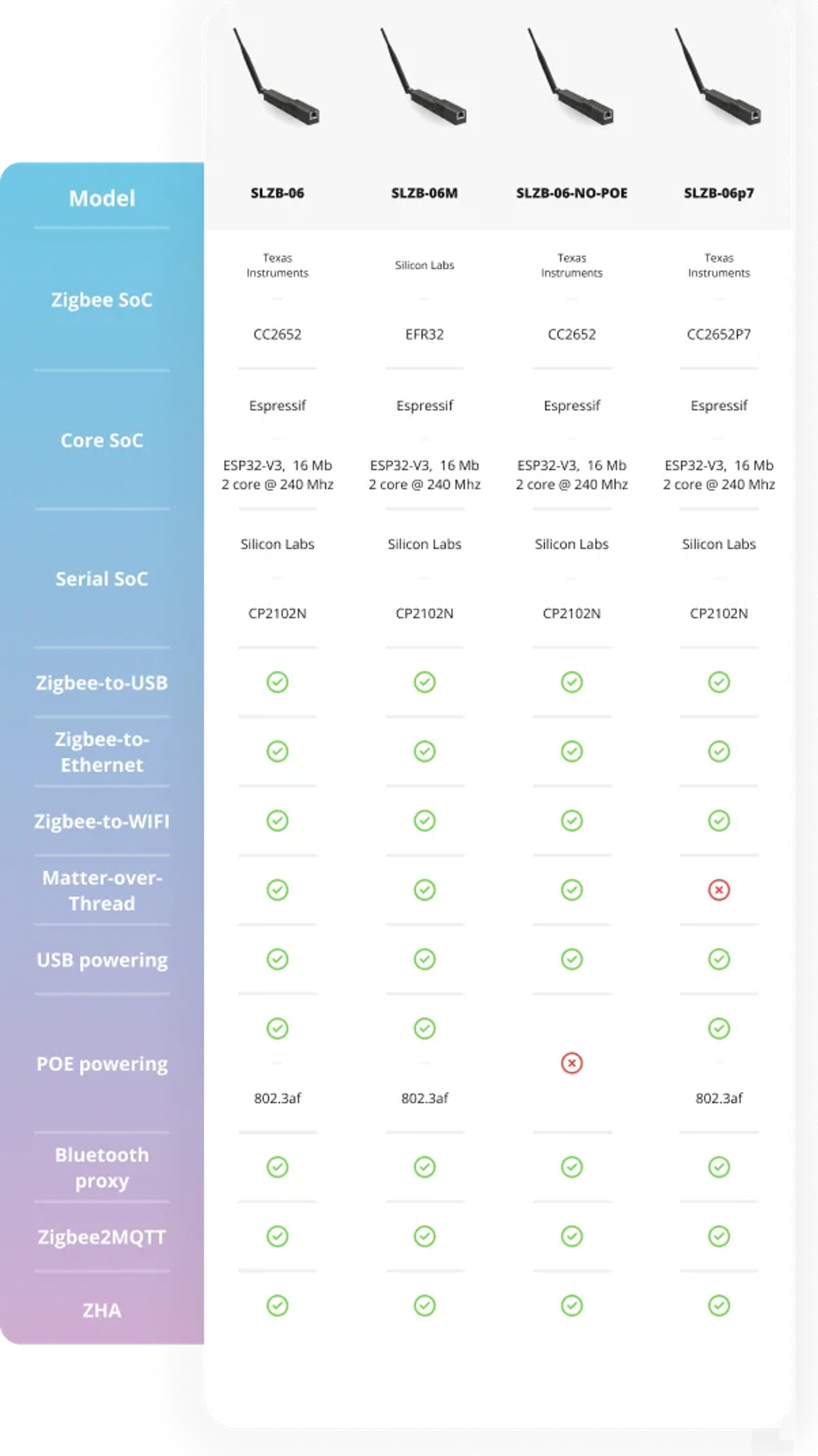 SLZB-06, SLZB-06M, SLZB-06P 세부 모델에 따라 zigbee 칩셋이 다릅니다.