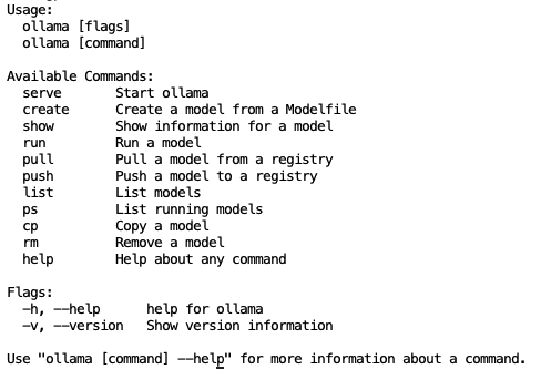 설치가 정상적으로 되었다면 ollama 명령어를 실행할 수 있게 됩니다.