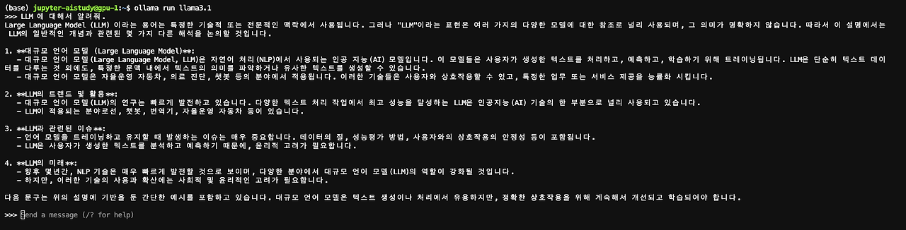 ollama 만을 활용해 llama 3.1 모델로 추론할 경우 아래와 같이 활용될 수 있습니다.