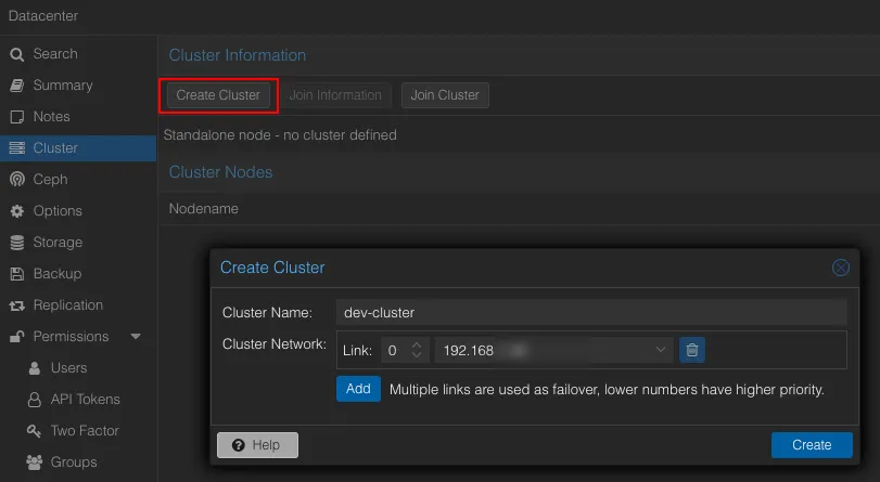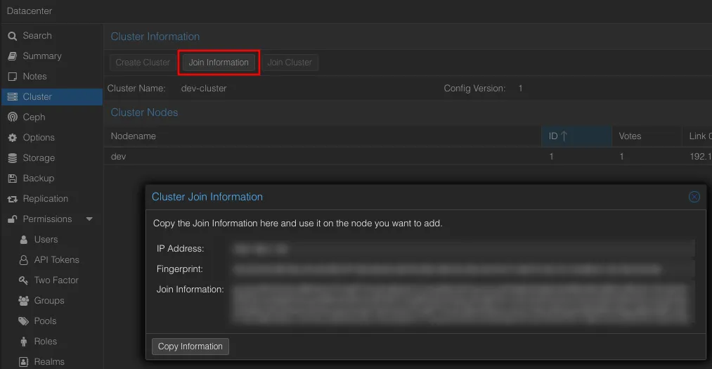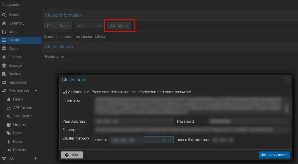클러스터에 참여할 proxmox 콘솔에서 위에서 복사한 Join Information 정보를 붙여넣고 필요 정보 입력