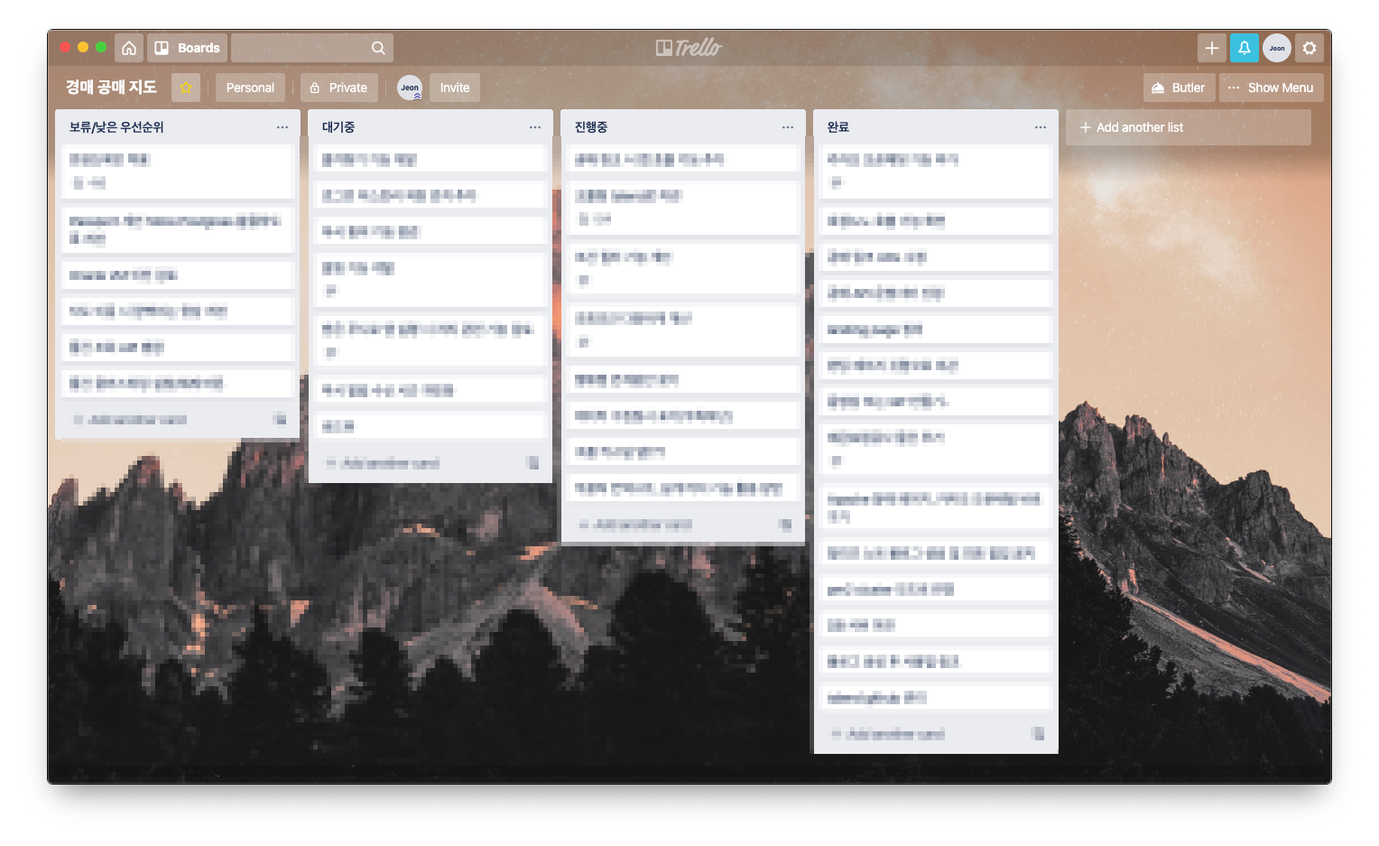 무엇을 해야 할지는 간단하게라도 관리하는 게 좋습니다. 엑셀을 쓰더라도 적당히 나태해지지 않게 할 도구는 필요합니다. 파워풀한 도구보다는 칸반보드 방식의 간단한 도구를 추천합니다. 아래 이미지는 보안상 가린 게 아니라 부끄러워서 모자이크 처리했어요 ㅎㅎ
