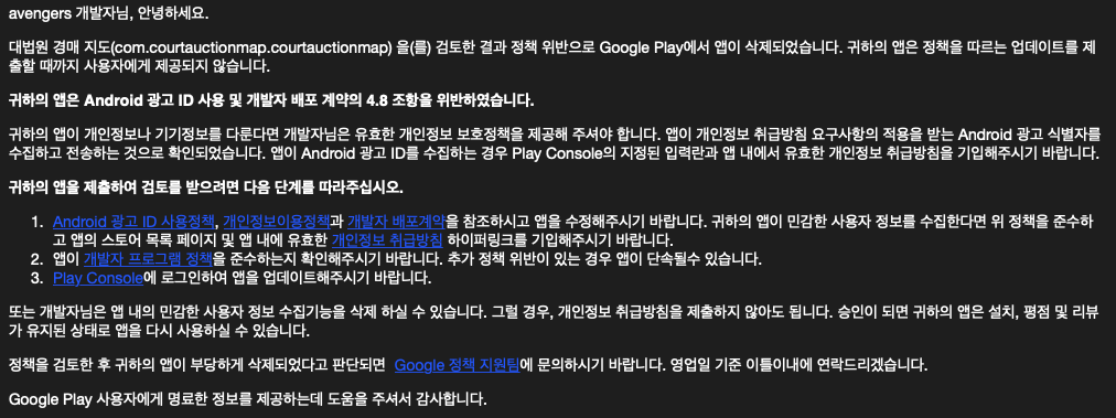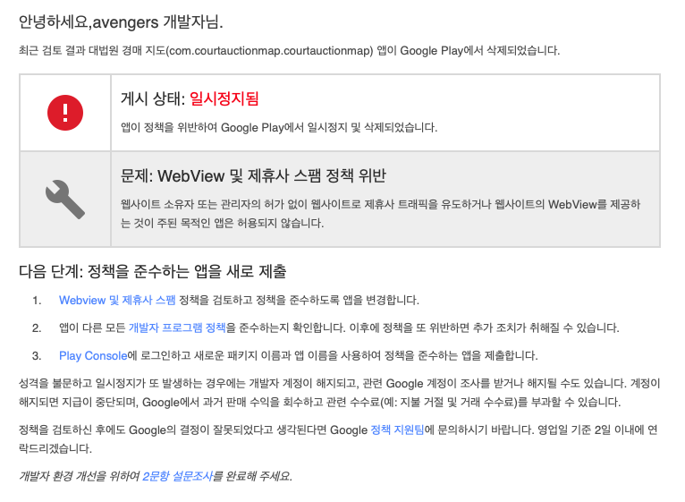 WebView 및 제휴사 스팸 정책 위반" 으로 검색해보시면 됩니다. 이때 스토어에서 몇 일 내려간 적이 있었습니다. 초반 신규 사용자가 늘어가는 시점에 참 어처구니없는 일이죠.