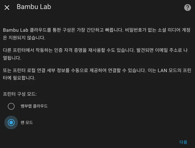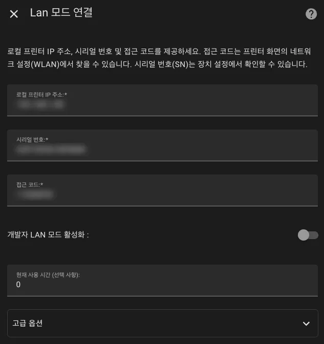 - Bambu Lab 앱 > 프린터 설정 > LAN 전용 모드에서 확인 가능