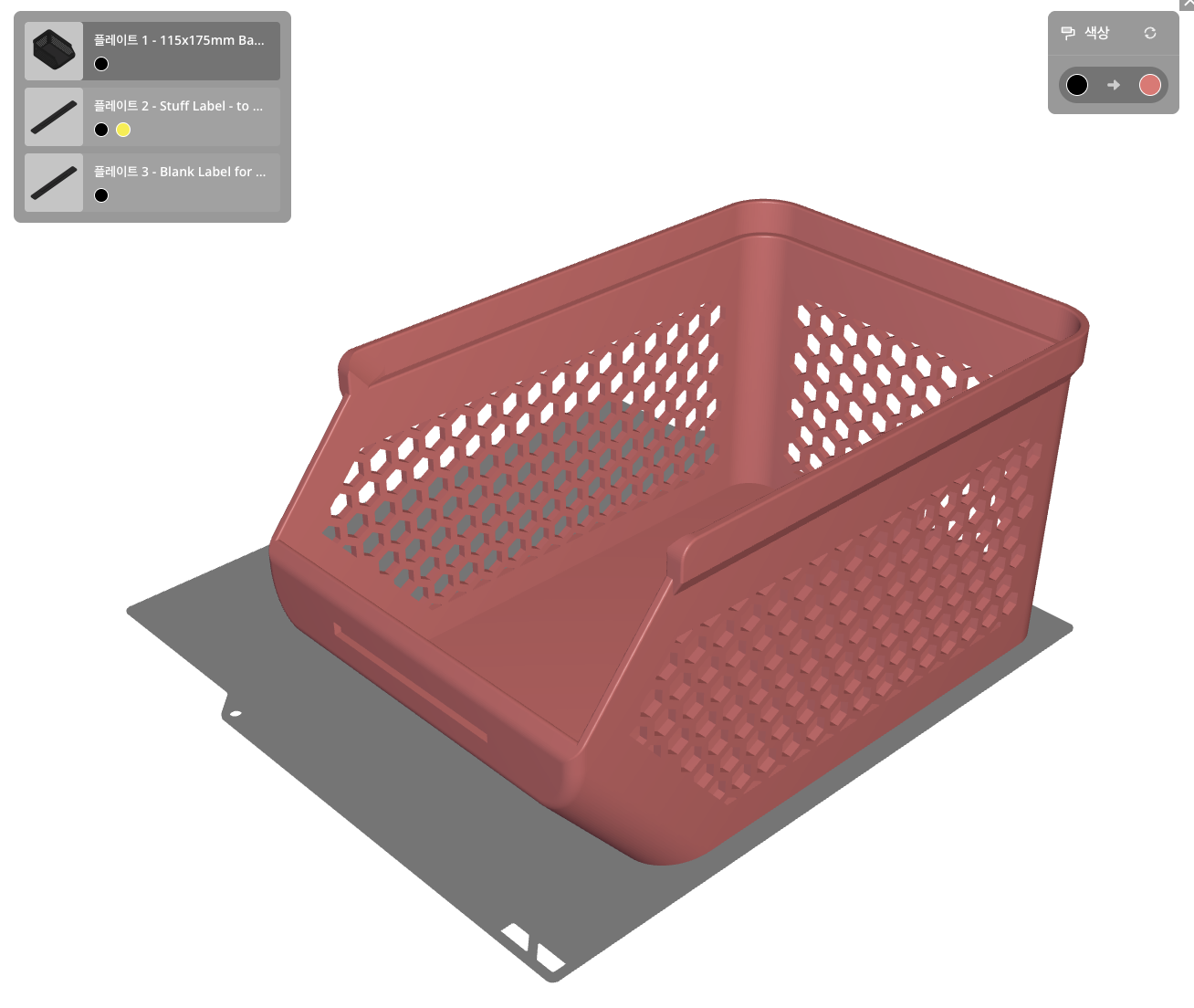 사이즈 실측해서 형상을 만들었으나.. 출력 시 크기가 플레이트를 넘어서기 때문에 나눠서 출력해야 함 맥이라 블렌더로 형상 만들기 자르기 후 커넥터 추가, 서포트 활성화 벽면 두께가 3mm 라서 실제 출력되었을 땐 원하는 형태로 출력되지 못함 수정해서 출력하지 않고 그냥 순간접착제로 붙여 쓰기로 함 처음 모델링을 해서 출력해보니... 공차에 대한 고려사항커넥터 기능이 생각보다 다를 수 있음형상부터 조립을 고려하는 것도 괜찮음필요 시 모서리 면은 곡면 처리 등등 잘 만들기엔 고려할 것이 많다는 것을 느낌...